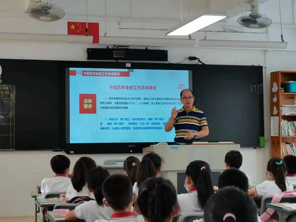 6月23日下午,教務(wù)處主任謝奕新在五(4)班開展省第十三代黨代會(huì)精神專題宣講。在專題學(xué)習(xí)宣傳過(guò)程中,謝主任從學(xué)校教學(xué)設(shè)施環(huán)境出發(fā),向?qū)W生簡(jiǎn)要講解省五年來(lái)的主要成就。帶領(lǐng)學(xué)生一起學(xué)習(xí)了過(guò)去五年的歷史性成就和彌足珍貴的經(jīng)驗(yàn)及今后五年的奮斗目標(biāo)和重點(diǎn)任務(wù)。學(xué)生在感受省飛速發(fā)展變化的同時(shí),引導(dǎo)廣大青少年兒童勤學(xué)習(xí)、樹理想、煉意志、強(qiáng)體魄、愛勞動(dòng),牢記領(lǐng)袖囑托、牢記初心使命,發(fā)揮當(dāng)代青年群體的力量,在奮力開創(chuàng)新的“黃金十年”偉大征程中努力成長(zhǎng)為新的“黃金一代”,讓黨的事業(yè)薪火相傳、紅色江山后繼有人!