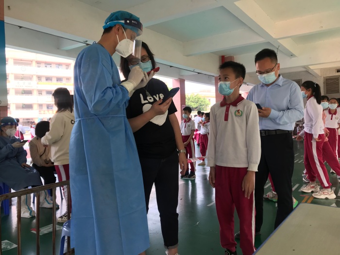 中山市校園疫情防控工作專班3月中旬新出臺的《中山市校園常態(tài)化核酸檢測工作方案》規(guī)定,學生在校期間實施每周一次的常態(tài)化核酸檢測。正值清明假期結(jié)束,開展一次全校全員核酸檢測更加事關重大,不可或缺。因此,清明節(jié)后返校第一天4月6日下午,開發(fā)區(qū)第一小學立即采取行動,全面展開核酸檢測工作。