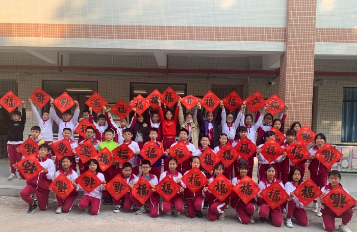 “?!弊质怯砷_(kāi)發(fā)區(qū)第一小學(xué)五(7)班書(shū)法老師丘志偉親自提筆書(shū)寫(xiě),由班主任錢(qián)玉老師協(xié)助分發(fā)至每一位孩子手中。拿到禮物,孩子們臉上寫(xiě)滿了幸福和快樂(lè)。