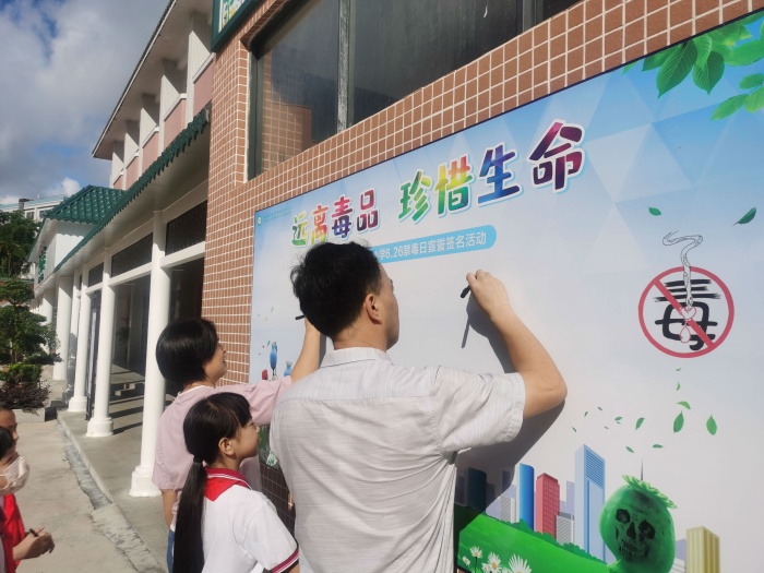 早上八點,鮮紅的國旗在國歌聲中冉冉升起,德育主任梁玉珊進行了國旗下講話。從中國廣東虎門銷煙的歷史,再到中國禁毒教育日的由來,接著向同學們介紹了毒品的概念和種類以及對人體的損害,并通過列舉事例,講述了毒品給家庭、社會、國家造成的危害,教育學生在生活中要提高自我防范意識,拒絕和遠離毒品,提高自我保護能力,并鼓勵同學們將了解到的毒品知識向身邊的人宣傳,當一名小小禁毒宣傳員。最后,梁主任帶領(lǐng)全體師生進行了“國旗下的毒品宣誓”。禁毒是全社會的共同責任,積極投身禁毒行列,從現(xiàn)在做起,珍愛生命、遠離毒品。最后,在學校行政領(lǐng)導的帶領(lǐng)下,師生代表在以“遠離毒品,珍愛生命”為主題的展板上簽名,亮出自己堅定的拒毒、禁毒決心!