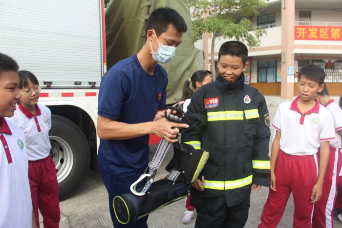 隨后,兩位消防叔叔帶領(lǐng)學(xué)生近距離參觀消防車和隨車裝備器材。他們?cè)敱M地為圍觀的學(xué)生講解各種消防器材的使用方法及作用。六7班雷博超同學(xué)幸運(yùn)地被選中為本次活動(dòng)的消防模特。消防員熟練地為他穿上消防員滅火防護(hù)服,使他親身感受消防服裝的重量,體驗(yàn)消防員使命的重量。生動(dòng)的消防情境教育法點(diǎn)燃了觀摩現(xiàn)場(chǎng)的沸騰,同時(shí),從另一角度在學(xué)生心中勾勒出火災(zāi)的危害性、消防員的危險(xiǎn)性以及日常防火、火災(zāi)逃生的重要性。