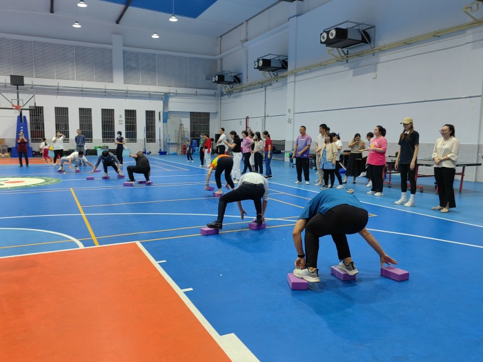 熱身完畢,老師們開始“摸著石頭過河”!左手搬磚,右腳前進(jìn)!右手提磚,左腳前進(jìn)!左右并前,手腳并用!老師們身心投入,誰都不服輸,誰也不讓誰,圍觀的“諸葛亮”七嘴八舌忙出主意?;顒?dòng)中,聽到了老師們的歡笑聲、喝彩聲,看到老師們不同于平日站在講臺(tái)上的另一面風(fēng)采,感受到老師們勝利時(shí)如孩子般的歡呼雀躍。總言之,痛快運(yùn)動(dòng),輕松解壓;快樂第一,無所謂結(jié)果!