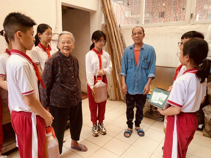 下午三點(diǎn),黃玲、錢(qián)玉兩位黨員教師帶領(lǐng)著10名少先隊(duì)員,帶著慰問(wèn)品來(lái)到老人家中。少先隊(duì)員們一邊異口同聲地問(wèn)候:“爺爺奶奶好”,一邊把慰問(wèn)品遞到老人手中。老人接過(guò)慰問(wèn)品,笑逐顏開(kāi)地說(shuō)著“謝謝”!然后,少先隊(duì)員又拿起掃把打掃老人家中的院落。爺爺奶奶非常欣慰、感動(dòng)。臨走時(shí),黨員教師和孩子們千叮嚀萬(wàn)囑咐,希望爺爺奶奶日常生活小心至上,保重好身體,照顧好自己。