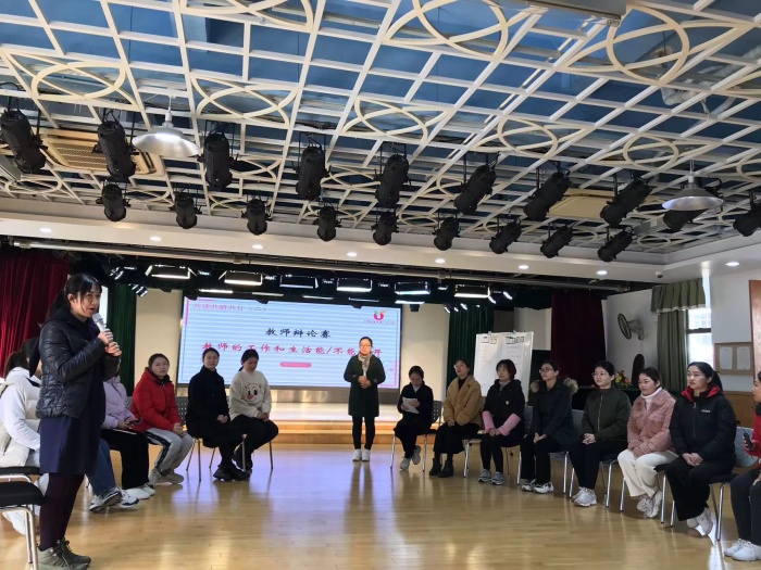 孩子的辯論會完畢之后,老師們精彩的辯論會開始了!16位教師爭相上臺展現(xiàn)自我風(fēng)采,他們以“工作和生活能不能分開”為辯題,正方認(rèn)為“生活與工作能夠分開”,反方認(rèn)為“工作生活不能分開”。在教師們激烈的辯論下,難分勝負(fù)。
