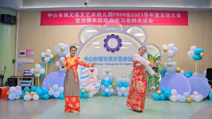接著,幼兒園為兩位老師制定出具體詳細(xì)的跟崗學(xué)習(xí)方案,對學(xué)習(xí)內(nèi)容和人員進行了細(xì)致安排,讓她們能和本園老師一視同仁地參與到日常各項教育教研活動中,毫無保留地傳遞分享幼教資訊,促進共同進步。兩位西藏老師積極投入各班教育教學(xué)活動中,感受自主、快樂、充滿人文關(guān)懷的教育氛圍;觀摩衛(wèi)生保健、清潔消毒、營養(yǎng)膳食和安全等方面的精細(xì)化管理工作;觀摩英語、體藝特色課2021年7月2日,學(xué)期結(jié)束之際,中山市博文英文藝術(shù)幼兒園組織全體教職工為迪花和扎西措姆兩位西藏老師舉辦了別開生面的歡送會。歡送會上,老師們載歌載舞互相交流,盧艷青園長還回顧了幼兒園在接待跟崗學(xué)習(xí)工作中的點點滴滴,指出了粵藏兩地幼教交流與融合的重要意義,并對兩位老師幾個月來在幼兒園虛心認(rèn)真的跟崗學(xué)習(xí)態(tài)度表示了充分的肯定。迪花和扎西措姆老師分別發(fā)表了跟崗學(xué)習(xí)感言,表示跟崗學(xué)習(xí)安排充實,來有所學(xué),學(xué)有所獲;并對幼兒園在生活、學(xué)習(xí)、工作上給予的無微不至的關(guān)懷和照顧表示感謝,表示跟崗結(jié)束后,會把在這里學(xué)習(xí)到的先進的教育理念和方法傳播回去,運用到實際的工作中。
