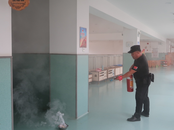 當(dāng)天上午10時,演習(xí)正式開始。著火地點為二樓生活館,廚具用品起火,教師、保安人員立即采取措施滅火,并報告?!盎鹎椤蓖蝗缙鋪?,警鈴聲大作,幼兒園迅速啟動消防工作預(yù)案。各班教師第一時間組織孩子們進(jìn)行疏散逃生,指導(dǎo)孩子們彎腰,用濕毛巾或衣物捂住口鼻,沿著制定的線路有序快速的撤離。僅僅2分鐘的時間,老師和孩子們?nèi)砍冯x到幼兒園操場的安全地帶。消防演習(xí)活動取得圓滿成功,各班在毫無預(yù)警的前提下,能較快較好地撤離,與平時狠抓安全教育是分不開的。