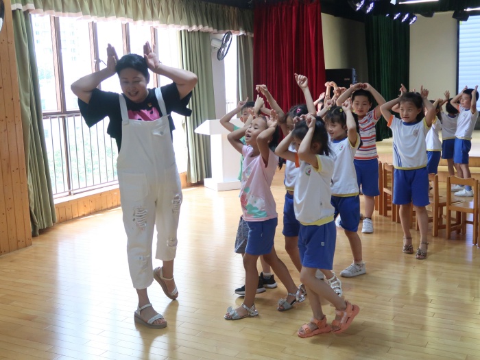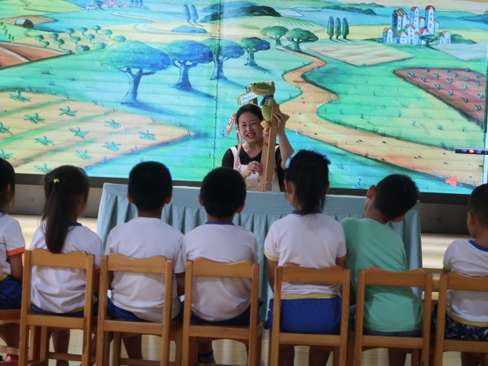 王萍書記以繪本故事《鱷魚愛上長頸鹿》為藍本,沿用了開發(fā)區(qū)第一幼兒園戲劇教育特色課程,親自原創(chuàng)戲劇活動《鱷魚愛上長頸鹿》,通過熱身游戲、手偶講故事、小組表演等戲劇策略與方法,讓幼兒了解了故事內(nèi)容、掌握了鱷魚與長頸鹿的外形特征,并通過肢體演繹,大膽表現(xiàn)與表征鱷魚與長頸鹿的形象特點,積極調(diào)動思維、發(fā)揮想象力,幫助鱷魚想辦法,與長頸鹿交朋友。