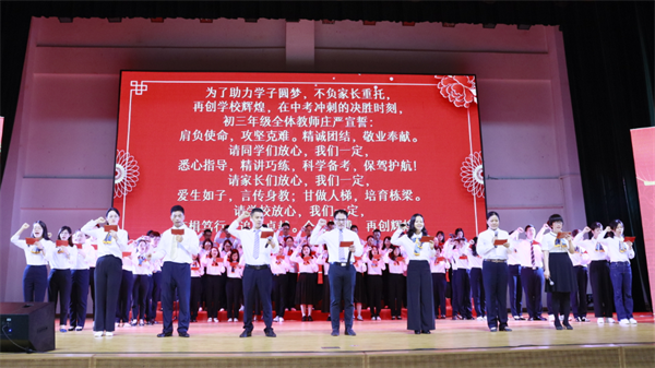 “紅星閃閃放光彩,紅星燦燦暖胸懷,紅星是咱工農(nóng)的心,黨的光輝照萬代……”誓師盛典以一首合唱《紅星伴我成長》拉開序幕,伴隨著激昂的旋律,校合唱團的同學(xué)們深情歌唱,向在場師生們歌唱作為新時代青少年需傳承好黨的光輝基因,未來需肩負起的責(zé)任和使命。從此刻起,不負光陰,不負韶華,以夢為馬,為迎戰(zhàn)中考立下錚錚誓言。