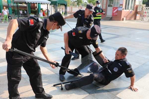 黨員教師隊(duì)伍和安保隊(duì)伍分組就模擬有暴徒襲擊學(xué)校的情境展開(kāi)演練。只見(jiàn)“暴徒”手拿兇器,試圖闖進(jìn)學(xué)校攻擊師生,教師和安保人員齊心協(xié)力,使用防暴棍、防暴盾牌等器械將“暴徒”制服。