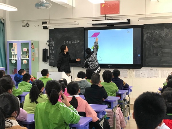 五年級(jí)備課組的朱楚媚老師執(zhí)教《多邊形的面積》一課。課堂上,環(huán)環(huán)相扣。第一環(huán)節(jié),先讓學(xué)生回憶推導(dǎo)平行四邊形、三角形、梯形面積公式的方法,再請(qǐng)小老師上臺(tái)講解。第二環(huán)節(jié),將所學(xué)過的面積公式串聯(lián)起來,讓學(xué)生進(jìn)行分類,發(fā)現(xiàn)它們之間的聯(lián)系,明確這些面積公式都是可以互相轉(zhuǎn)化的,從而幫助學(xué)生形成完整的知識(shí)網(wǎng)絡(luò)。第三環(huán)節(jié),遵循學(xué)生的認(rèn)知規(guī)律,設(shè)計(jì)有梯度的三類題目,分別是基礎(chǔ)題、進(jìn)階題、拓展題,由淺入深,照顧各個(gè)層次學(xué)生需求。