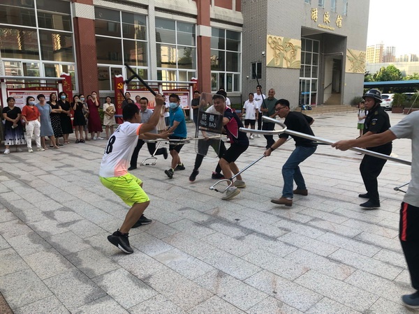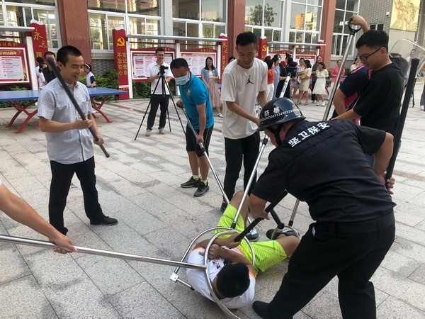 安保隊伍和男教師們就模擬有不明身份男子“襲擊”學(xué)校的情境展開演練。一名攜帶危險用品的男子欲強行進入校園進行施暴。學(xué)校安保隊伍和男教師們第一時間到位,使用防暴棍、防暴盾牌等工具將其成功制服。
