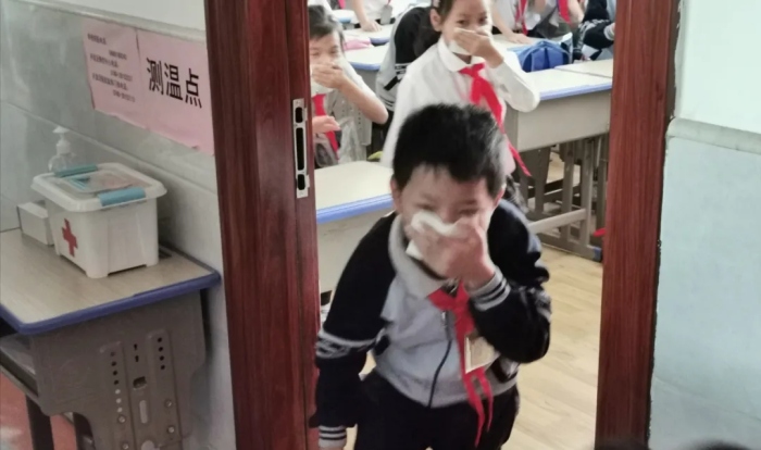 11月9日下午14點30分演練開始,隨著警報的響起,各位老師立即到達指定崗位,確保演練過程的安全,并指導學生有序快速疏散。各班班主任帶領學生根據演練方案中規(guī)定的路線,彎著腰,用濕紙巾或手等捂住口鼻,沿著學校指定樓梯口快速疏散,有序撤離到學校操場的安全地帶。