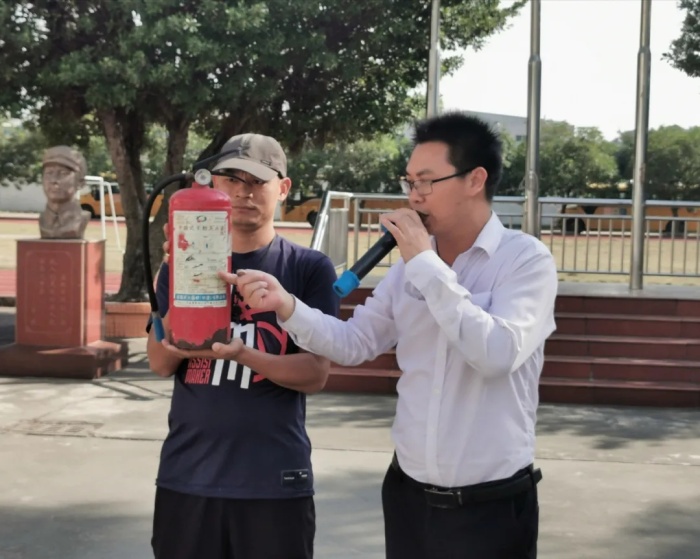 負責安全的俞希金老師非常仔細的向在場師生講解干粉滅火器的使用方法:“把滅火器罐上下晃動三次以上,將安全梢拉開,握住出粉皮管,將皮管朝向火點,距離火點2米左右用力壓下把手,對準火苗根部噴射?!贝蠹叶祭卫斡涀×藴缁鹌鞯氖褂梅椒ā耙粨u、二拔、三噴”。隨后老師手把手的教學生使用干粉滅火器,滅火成功后,學生們臉上洋溢著成功的喜悅。