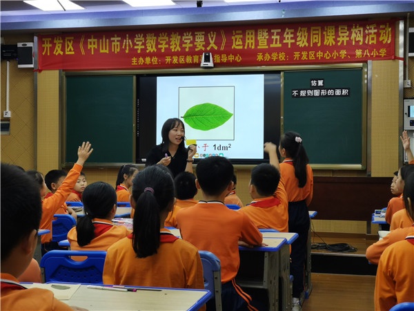 第一環(huán)節(jié)為觀摩同課異構(gòu)課堂。由開發(fā)區(qū)中心小學(xué)的李玲珊老師和開發(fā)區(qū)第八小學(xué)的李文鏗老師分別執(zhí)教了五年級(jí)《估算不規(guī)則圖形的面積》。李玲珊老師循循善誘,引導(dǎo)學(xué)生如何估測(cè)一片葉子的面積,尋找區(qū)間,通過圍學(xué)活動(dòng)經(jīng)歷猜測(cè)、操作、交流等數(shù)學(xué)活動(dòng),學(xué)會(huì)數(shù)方格和轉(zhuǎn)化為規(guī)則圖形估計(jì)出不規(guī)則圖形的面積,收獲了良好的教學(xué)效果;李文鏗老師大膽開放課堂,提供學(xué)具,讓學(xué)生通過觀察、猜想、實(shí)踐、驗(yàn)證等活動(dòng),體驗(yàn)用不同方法估算一片葉子的面積全過程,靈活運(yùn)用估算方法解決面積問題,提升學(xué)生的量感能力。