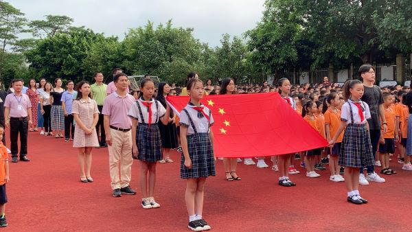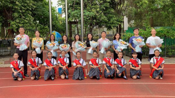 首先,全體師生舉行莊嚴(yán)的升旗儀式?,F(xiàn)場,全體肅立,伴隨著雄壯的國歌聲,五星紅旗冉冉升起。學(xué)校禮儀隊的少先隊員們?yōu)榻處煷慝I(xiàn)花。來自一至六年級級組、藝術(shù)科組、體育科組、綜合科組、行政組共10名教師代表接受獻(xiàn)花。來自四(2)班的優(yōu)秀少先隊員代表陳泳霖同學(xué)致辭,表達(dá)對全體教師感激之情。最后,全體同學(xué)齊唱《聽我說謝謝你》。當(dāng)2800余名孩子們用稚嫩的聲音齊聲高唱“你是我的天使,一路指引我,無論歲月變幻,愛你唱成歌。聽我說謝謝你,因為有你,溫暖了四季……”溫情的歌聲傳達(dá)著孩子們對老師諄諄教誨的無限感激。在這無限感動的一刻,眼眶濕潤著的老師們感到了為人師者的莊重與神圣,欣慰與幸福。