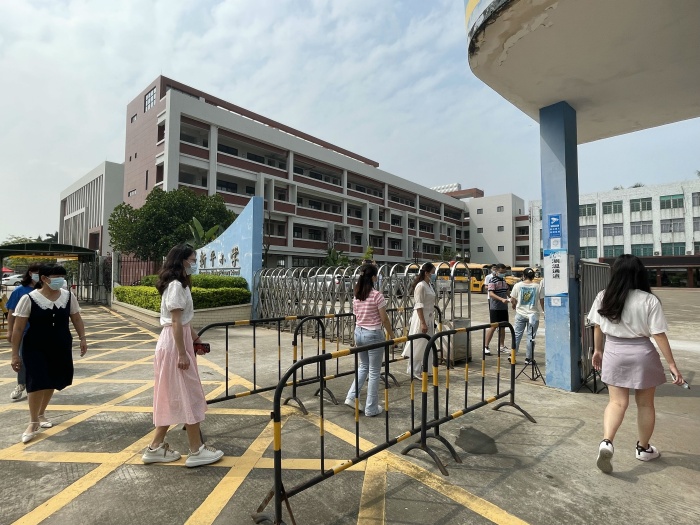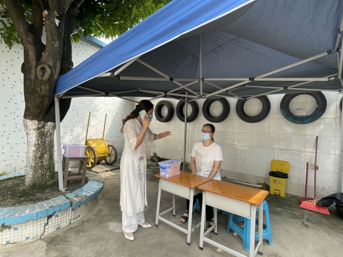 演練正式開始,梁文輝校長為本次演練的總指揮;本次分為三個(gè)主要演練內(nèi)容,第一:師生進(jìn)校演練;師生佩戴好口罩,有序地間隔1米排隊(duì)依次測溫進(jìn)校。如發(fā)現(xiàn)學(xué)生體溫異常,應(yīng)急處置老師聯(lián)系衛(wèi)生應(yīng)急處置員,衛(wèi)生應(yīng)急處置員將體溫異常的學(xué)生帶到隔離室復(fù)測體溫,體溫是異常的應(yīng)致電班主任,并按衛(wèi)生應(yīng)急處置員按流程規(guī)范進(jìn)行處置。第二:上課出現(xiàn)異常應(yīng)急演練;班主任對學(xué)生詢問“三史”,確認(rèn)無異常后準(zhǔn)備上課。如有學(xué)生舉手報(bào)告身體不舒服,上課老師安排好其他學(xué)生自學(xué)任務(wù)后,給報(bào)告者測體溫,體溫異常的致電張容冰主任,班主任相隔1米,帶學(xué)生到留觀室,衛(wèi)生管理員按流程規(guī)范進(jìn)行處置。然后班主任對全班學(xué)生逐一進(jìn)行體溫檢測,確認(rèn)均無異常后,帶領(lǐng)學(xué)生由疏散專用通道離開,到備用課室。同時(shí)通知消毒員對課室及專用通道進(jìn)行消毒處理。第三:師生核酸采樣演練:如校內(nèi)發(fā)生不明來源新冠病毒肺炎本土病例或密切接觸者時(shí),需開展全員新冠病毒核酸采樣。班主任組織學(xué)生分四列,分別站在臨時(shí)觀察區(qū)兩側(cè)依次檢測,每組檢測10人,檢測完成后學(xué)生直接回教室。