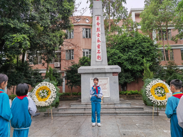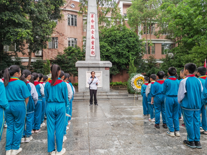 與此同時(shí),育才小學(xué)少先隊(duì)大隊(duì)部組織優(yōu)秀少先隊(duì)員代表,排著整齊的隊(duì)伍,懷著無比崇敬的心情來到民眾街道革命烈士碑前,參加民眾街道“追憶革命先烈,爭當(dāng)紅色傳人”祭掃烈士墓活動。在烈士紀(jì)念碑前,同學(xué)們首先全體肅立,低頭三鞠躬,然后認(rèn)真聆聽街道關(guān)工委“五老”李玉珍老師講述民眾烈士英雄的事跡,聆聽關(guān)工委李錫洪主任的諄諄教誨,五(3)班黃雅詩同學(xué)代表在場少先隊(duì)員講話,對為保衛(wèi)家鄉(xiāng),保衛(wèi)祖國而獻(xiàn)出青春熱血的革命英烈表示沉痛的哀悼,表達(dá)努力拼搏,爭當(dāng)新時(shí)代好少年的決心。