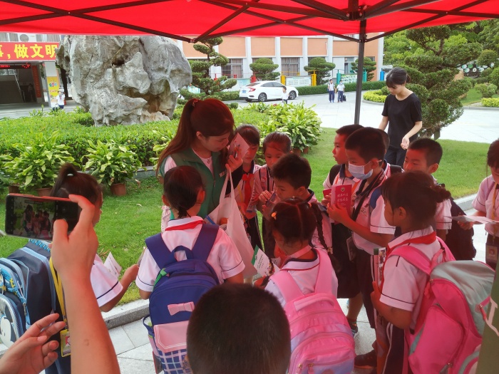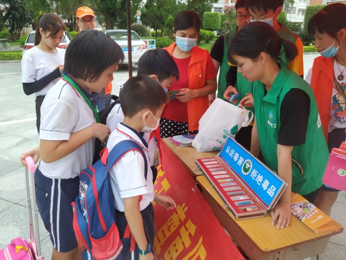 班會課后,云衢小學(xué)的家委參與到禁毒辦社工的禁毒宣傳工作中,他們在云衢小學(xué)學(xué)校文化石旁擺起了攤位,派預(yù)防毒品的宣傳單張,社工和家委們向?qū)W生們講解和認(rèn)識毒品知識,向?qū)W生提問,回答正確的可以得到禮品,學(xué)生們樂于參加這種宣傳活動,效果非常不錯。