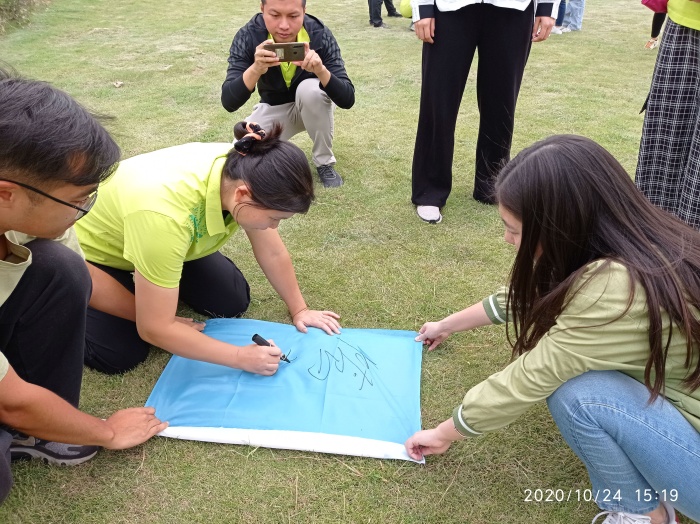 隨后,團隊教練將全體教師隨機分成了四個隊伍,大家集思廣益制作隊旗,創(chuàng)作隊名、口號及團隊造型。接著,在各隊長的帶領(lǐng)下,全隊隊員經(jīng)過練習(xí)后,四個隊伍在規(guī)定的時間內(nèi),順利完成乾坤大挪移、中國龍、激情節(jié)拍等項目?;顒又校课焕蠋煻既橥度?,共同克服每一個困難,笑聲、加油聲、口號聲、歡呼聲響徹大地!