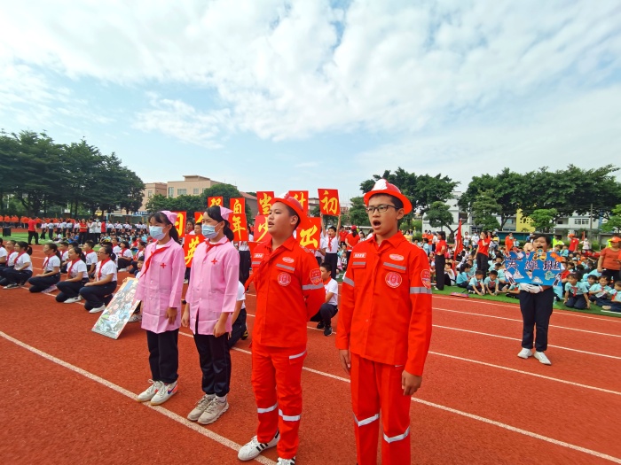 活動第一項是本次體育節(jié)暨田徑運(yùn)動會的開幕式。南頭鎮(zhèn)教育和體育事務(wù)中心主任謝桂華、體育專干黃再玲老師、藝術(shù)專干姚利芳老師,南頭鎮(zhèn)關(guān)工委副主任黃祺宗、梁細(xì)言委員、何華嬌委員、梁映娟委員到現(xiàn)場觀看入場式。首先是進(jìn)行入場儀式,隨著運(yùn)動員進(jìn)行曲的響起,國旗隊、隊旗隊以及各班級方陣在主持人激情洋溢的解說中入場。孩子們矯健的步伐,鏗鏘有力的班級口號,方陣隊的展演精彩紛呈、震撼人心,有致敬快遞小哥、物流司機(jī)、社區(qū)疾控、公安民警、消防官兵、抗洪戰(zhàn)士、醫(yī)生、白衣天使、送菜農(nóng)民、火神山雷神山醫(yī)院建設(shè)工人、北斗導(dǎo)航工程師、5G技術(shù)人員……學(xué)生身著各個職業(yè)的服裝,將英雄的故事展演,向偉大的時代英雄致敬!全校二十八個班級精神抖擻,神采飛揚(yáng),排著整齊的隊伍依次入場,充分展現(xiàn)了民安小學(xué)師生的蓬勃朝氣和青春活力。最后進(jìn)場的是民安小學(xué)家長義工隊方陣,他們?yōu)榧倚D軌蚋玫暮献鞲冻隽瞬恍傅呐Α?/p>