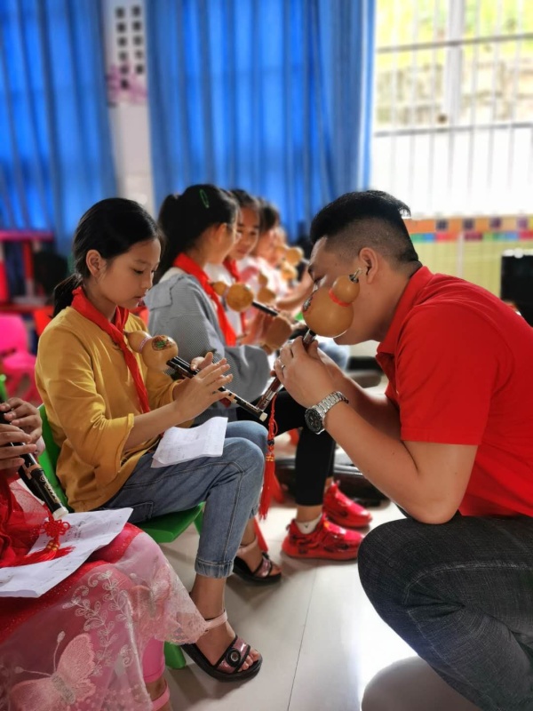 吳老師想既然來了總要留點(diǎn)什么下來,計(jì)劃開設(shè)學(xué)校葫蘆絲社團(tuán),并把自己的想法與校長進(jìn)行溝通,由于學(xué)校經(jīng)費(fèi)有限,向上級領(lǐng)導(dǎo)申請,最后得到教育局吳股長的支持。孩子們雖然沒有學(xué)習(xí)過音樂知識,每個音、手型、節(jié)奏、呼吸、演奏方法等,學(xué)生們都是零基礎(chǔ),這不得不讓吳老師一個音一個音,一個手指一個手指地教,短短的一周葫蘆絲學(xué)習(xí)中,孩子們基本掌握一首簡短的歌曲。除了學(xué)生,學(xué)校老師甚至校長都參加了學(xué)習(xí),這讓吳老師非常感動。