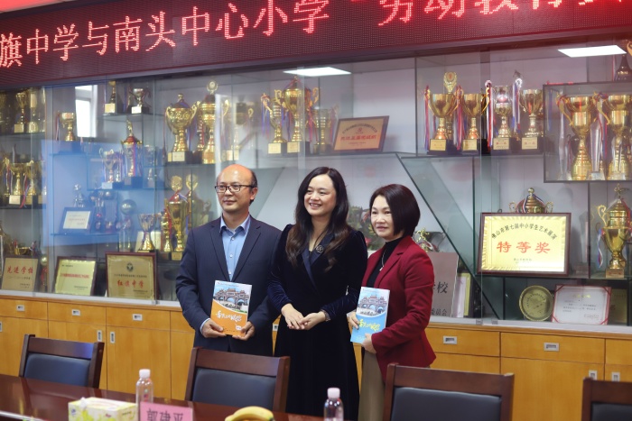 講座結(jié)束后陳亞玲校長贈(zèng)送給南頭鎮(zhèn)中心小學(xué)勞動(dòng)教育校本教材讀本、紅旗中學(xué)建校35周年紀(jì)念品,郭建平、吳婉韻兩位副校長代表接收,活動(dòng)圓滿結(jié)束。