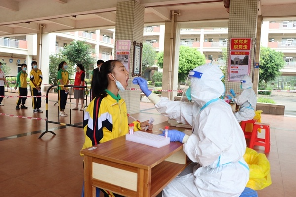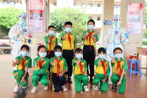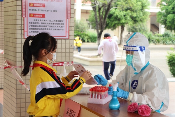 在核酸檢測現(xiàn)場,學校行政協(xié)調(diào)指揮,合理安排班級學生到達現(xiàn)場,避免人群聚集。同學們自覺佩戴口罩,在班主任的帶領下來到等候區(qū),間隔一米排隊,有序安靜地候場。在志愿者老師幫學生掃碼錄入信息后,同學們依次進行核酸檢測。一聲真誠的“謝謝”、一個禮貌的鞠躬,表達了孩子們對醫(yī)護人員辛勤付出的感謝與敬佩。經(jīng)過全體師生的全力以赴和全力配合,整個核酸檢測工作得以安全、有序地推進,一個早上便高效采集1266份樣品,圓滿完成校園核酸檢測工作。最后,一首《聽我說謝謝你》歌曲響徹校園,致敬負重前行、無私奉獻的一線防疫工作者,歌聲傳遞著孩子們感恩的心,情誼流淌在校園防疫篇章里。