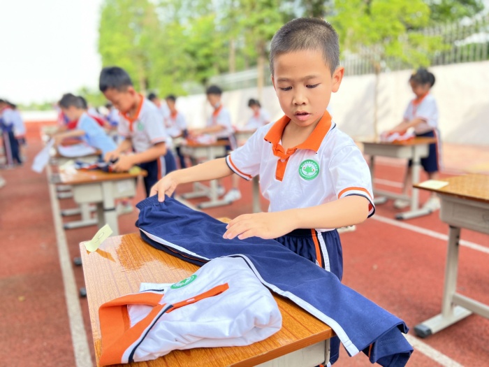 一年級進(jìn)行的是疊衣服比賽,同學(xué)們雖然年紀(jì)小,但是疊起衣服來可是有模有樣。孩子們?nèi)σ愿?,快速、整齊、高質(zhì)量地完成比賽任務(wù),爭先恐后地舉起自己的小手示意已經(jīng)完成比賽。二年級進(jìn)行的是穿衣服、佩戴紅領(lǐng)巾比賽。同學(xué)們動作迅速,手法嫻熟,衣服和紅領(lǐng)巾穿戴得又快又美觀!