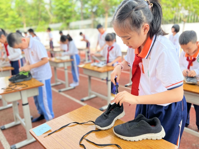 系鞋帶是孩子們每天都要做的事。比賽過程中,同學(xué)們熟練地穿起了鞋帶,接著,同學(xué)們抓起鞋帶兩端,交叉、打結(jié)、綁緊,動作迅速又靈活。在一雙雙巧手的牽引下,細(xì)長的鞋帶化為了一只只美麗的蝴蝶結(jié)。四年級的同學(xué)們低著頭認(rèn)真地削著蘋果,他們一邊握著水果刨,一邊轉(zhuǎn)動著手中的蘋果,薄薄的蘋果皮一圈圈地掉下。削完后,每個同學(xué)都展示著削得干干凈凈的蘋果,咬一口,分外香甜。
