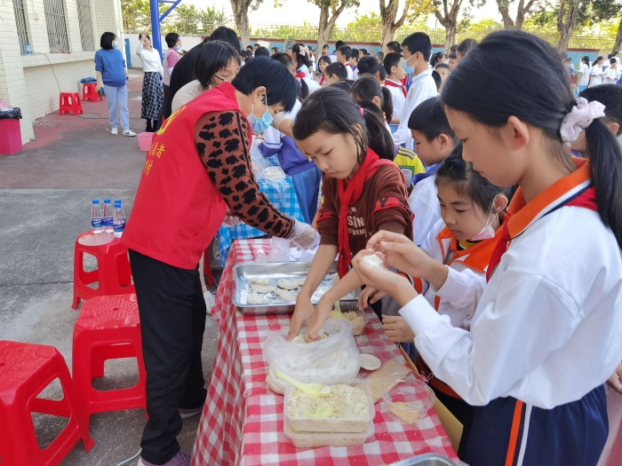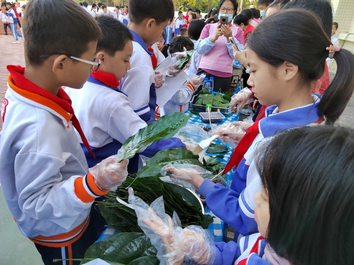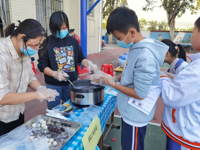 在傳統(tǒng)美食攤位,在老師們的帶領(lǐng)下,同學們將日常勞動的收獲成果轉(zhuǎn)變成全校的傳統(tǒng)美食共享大會。瞧,同學們大展身手,化身“小廚神”,制作出了一道道色香味俱全的傳統(tǒng)美食,餃子、香湯圓、茶果、冰糖葫蘆、油角、艾餅、還有三角特色美食水煮生魚等等,可謂應有盡有,令人三尺。