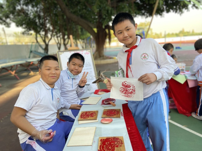 在傳統(tǒng)工藝攤位上,同學們圍坐一起,積極參與了陶藝、茶藝、剪紙、板畫、布染、再造紙、風箏制作、毽子制作等傳統(tǒng)工藝制作,場面溫馨。