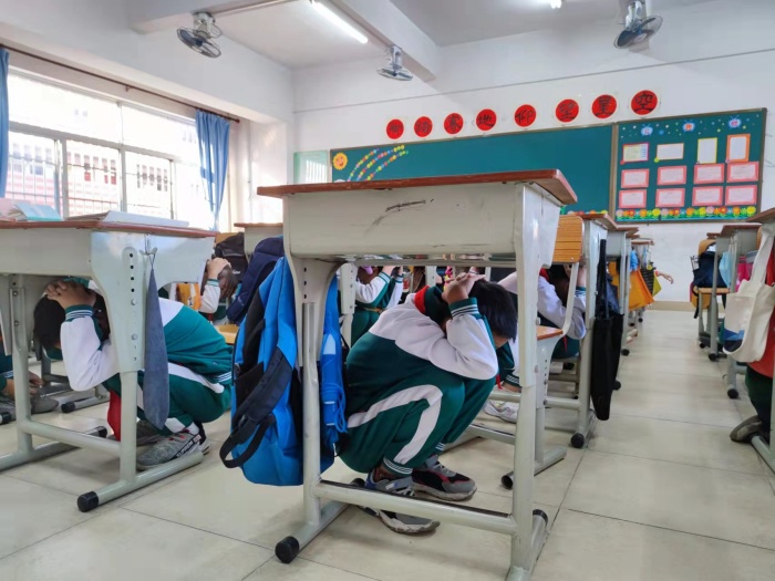 第一次警報(bào)聲響起,演練正式開始,各班教師馬上停止了一切教學(xué)活動(dòng),同學(xué)們也紛紛放下手中的書本,在老師的指引下,雙手抱頭、快速有序地躲藏在自己的課桌底下,并保持鎮(zhèn)定。