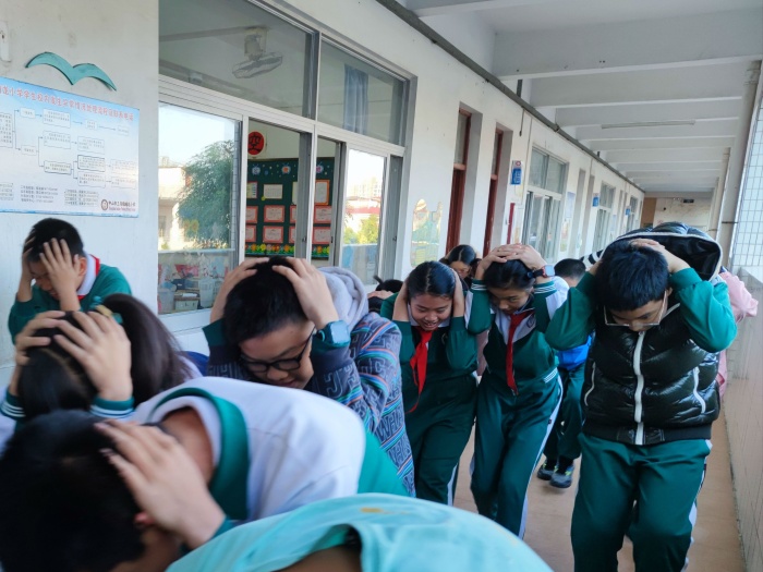 第二次警報(bào)聲響起,各班老師組織學(xué)生們按預(yù)定的疏散路線迅速有序地撤離到戶外安全地帶。學(xué)生們撤離到操場(chǎng)中心后,立即蹲下并雙手抱頭。老師及時(shí)清點(diǎn)人數(shù),檢查傷亡情況。