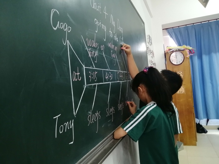 四年級的郭鳳鈴老師執(zhí)教Unit4 My Day的故事課,圖形組織者貫穿整節(jié)課的教學(xué)。郭老師以圖促讀,引導(dǎo)學(xué)生仔細(xì)觀察圖片,帶著問題學(xué)習(xí)故事,激發(fā)閱讀動機(jī)。同時,郭老師循循善誘,給學(xué)生示范如何一邊閱讀故事,一邊制作魚骨圖。在支架的幫助下,學(xué)生自主閱讀故事剩下的部分,小組合作完善魚骨圖。最后,郭老師引導(dǎo)學(xué)生借助魚骨圖復(fù)述故事,促進(jìn)學(xué)生對文本的理解和掌握,進(jìn)一步發(fā)展學(xué)生的語用能力。在學(xué)習(xí)能力培養(yǎng)的同時,郭老師也有意識地幫助形成學(xué)生的文化品格,滲透情感價值觀:在合適的時間做合適的事情,凡事要做好詳細(xì)的計劃。