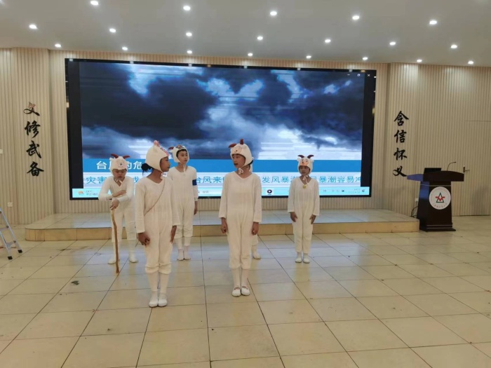 接著由中山市三鄉(xiāng)鎮(zhèn)大布小學(xué)氣象社團帶來精彩的科普劇表演。大布小學(xué)的氣象社團一直得到中山市氣象局、中山市氣象學(xué)會的支持,以創(chuàng)新社團形式推廣氣象科普知識。大布小學(xué)嘗試以學(xué)生喜聞樂見的課本劇為藍(lán)本,以臺風(fēng)“洋洋得意”吹襲羊村的故事,將臺風(fēng)的知識,臺風(fēng)危害以及做好臺風(fēng)預(yù)防措施變成課本劇,讓學(xué)生在輕松的氛圍下學(xué)習(xí)氣象知識,讓科學(xué)知識更深入的扎根在學(xué)生的心中,與青山綠水共為鄰。