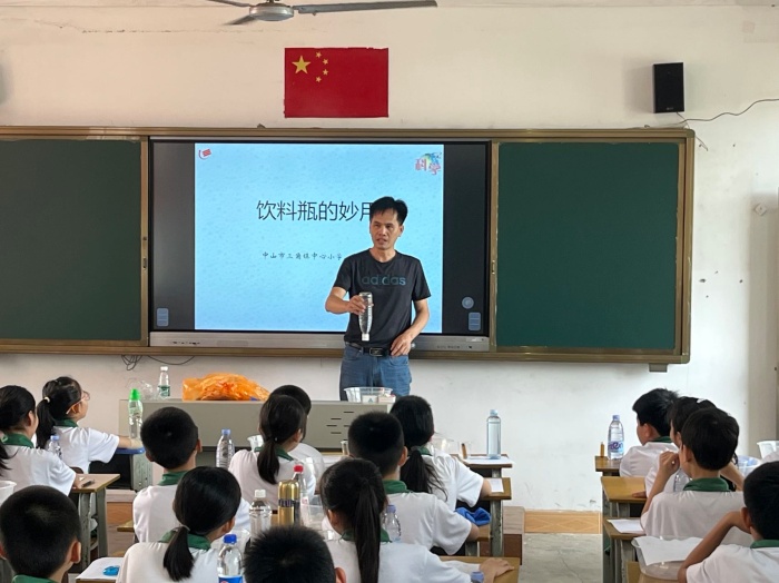 首先是課堂教學(xué)展示。中山市三角鎮(zhèn)中心小學(xué)馮細(xì)有老師獻(xiàn)上科學(xué)課《飲料瓶的妙用》。馮老師利用飲料瓶、水、小玻璃瓶等道具,先演示了玻璃瓶在裝滿水的瓶子里上下浮動(dòng),再叫同學(xué)上來嘗試,然后解釋了其原理,引導(dǎo)學(xué)生自主探究,讓他們利用實(shí)驗(yàn)原理自己動(dòng)手實(shí)驗(yàn)。相信試驗(yàn)成功的學(xué)生心中充滿了成就感。