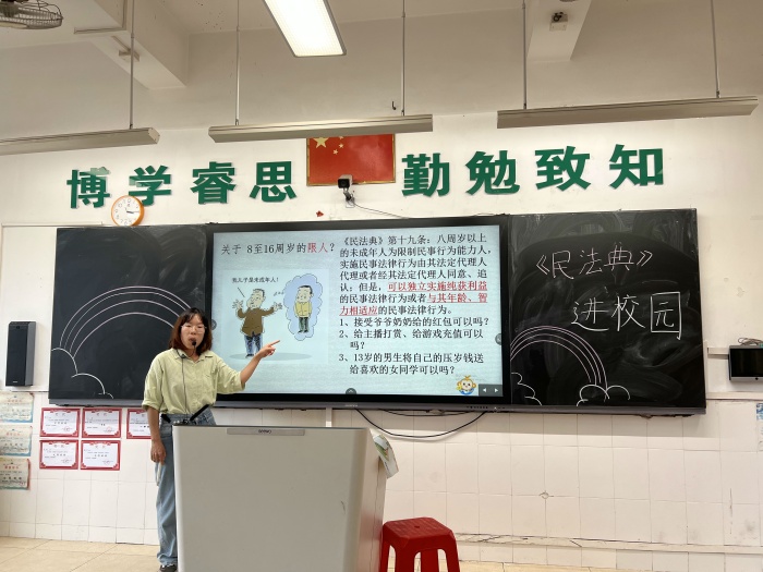 班隊(duì)課上,班主任向同學(xué)們介紹了民法典的概況,從“民法典與小明一生”的故事切入,生動形象地向同學(xué)們講解了《民法典》中涉及民事行為能力、人格權(quán)、高空拋物等與日常生活息息相關(guān)的法律條款,利用典型案例深入剖析了背后的法理知識,把“紙上的法律”變?yōu)椤艾F(xiàn)實(shí)生活中的法律”。同學(xué)們聽得津津有味、深受啟發(fā)?;顒咏Y(jié)束后,同學(xué)們紛紛表示要做勤奮好學(xué)的好學(xué)生,遵紀(jì)守法的好公民。