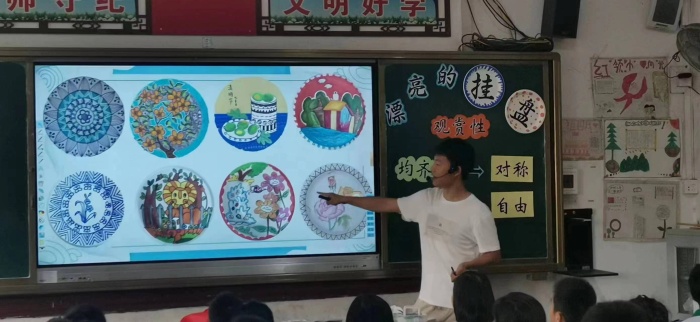 首先是李孟陽(yáng)老師的美術(shù)課《漂亮的掛盤》。盤子是學(xué)生們常用的盛菜工具,而藝術(shù)掛盤卻是農(nóng)村孩子不常見(jiàn)的工藝品,為了讓學(xué)生感受美術(shù)與生活的關(guān)系,李老師精心設(shè)計(jì)了本節(jié)課,通過(guò)視頻和圖片讓學(xué)生了解掛盤,感受其均齊式的韻律之美與平衡式的輕松自由之美,經(jīng)過(guò)李老師細(xì)致地講解和投影畫(huà)畫(huà)示范,同學(xué)們開(kāi)始創(chuàng)作。二十分鐘后,一幅幅精美而不重樣的掛盤作品浮現(xiàn)在眼前,李老師給予學(xué)生極大的肯定。一節(jié)課下來(lái),學(xué)生學(xué)會(huì)了運(yùn)用適合裝飾紋樣裝飾掛盤,也提高了欣賞美與創(chuàng)造美的能力。