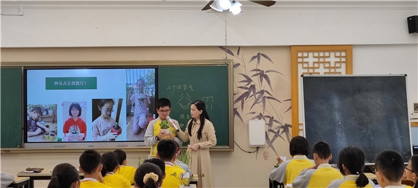 隨后,曾青竹老師在文學(xué)社展示一節(jié)傳統(tǒng)文化課例——《谷雨》。曾老師采用小組學(xué)習(xí)的方式,引導(dǎo)學(xué)生課前搜集與谷雨節(jié)氣有關(guān)的知識(shí):節(jié)氣起源、節(jié)氣特點(diǎn)、節(jié)氣風(fēng)俗、與節(jié)氣有關(guān)的詩(shī)歌等,并種植適合這個(gè)季節(jié)生長(zhǎng)的植物。放眼教室,一盆盆綠植映入眼簾,孩子們興趣盎然地分享自己收集到的資料以及種植的體驗(yàn),在生動(dòng)活潑的課堂氛圍中,孩子們逐漸加深對(duì)谷雨節(jié)氣的理解。接著,曾老師給孩子拓展學(xué)習(xí)了一些和谷雨有關(guān)的詩(shī)歌,并帶領(lǐng)孩子學(xué)習(xí)吟唱,讓孩子們對(duì)谷雨節(jié)氣有了更深入的了解,收到了很好的教學(xué)效果,得到了專家組的充分肯定。