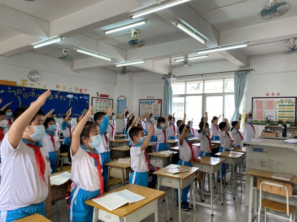 早上8:00,雍陌小學(xué)四至六年級的全體學(xué)生和全校教師一起,共同觀看了中山市體育和教育局錄制的復(fù)學(xué)第一課“天使歸來,英雄開講”主題升旗儀式。