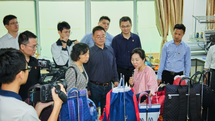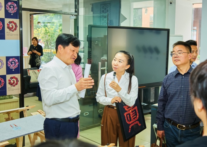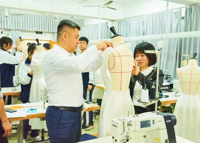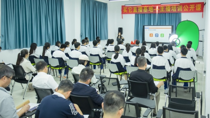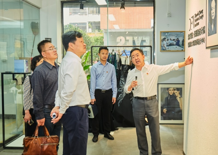 專家們?nèi)胄:?,分成兩組到創(chuàng)意園服裝一樓一體化室服裝專業(yè)課堂、直播基地電商直播課堂,現(xiàn)場觀摩師生上課。在服裝專業(yè)課上,師生們正在進行《夏日優(yōu)雅 ——時尚連衣裙環(huán)浪領(lǐng)立體造型》項目教學(xué)。這一項目根據(jù)碩森公司所設(shè)校內(nèi)工作室的設(shè)計制單要求發(fā)放任務(wù),由何靜林老師設(shè)計,胡建兒老師主講,企業(yè)老師武燦最后點評。在聽課過程中,專家們饒有興致,也走到工位對著人模操作貼片造型,體驗“做中學(xué)、學(xué)中做”的教學(xué)實質(zhì)。在《直播電商基礎(chǔ)》上,周曉檸老師依據(jù)買它直播公司所下發(fā)的“農(nóng)產(chǎn)品直播”任務(wù)進行項目教學(xué),帶領(lǐng)學(xué)生依據(jù)產(chǎn)品賣點FAB法則,結(jié)合五感體驗法深挖產(chǎn)品賣點,借助企業(yè)虛擬直播間技術(shù),帶領(lǐng)學(xué)生體驗農(nóng)產(chǎn)品直播,最后由企業(yè)師傅小春老師就學(xué)生直播情況作點評指導(dǎo)。