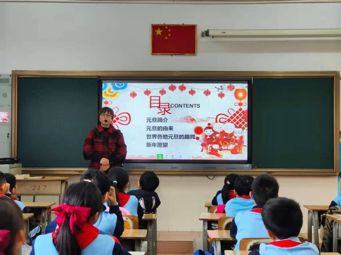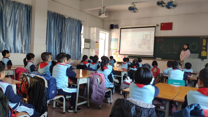 本次活動(dòng)在各班班主任對(duì)學(xué)生衷心的新年祝福中開始,班主任寄語(yǔ)學(xué)生們?cè)谛碌囊荒昀锷眢w健康,學(xué)習(xí)進(jìn)步。簡(jiǎn)單的語(yǔ)言,卻承載著老師最真心的祝福,同學(xué)們也紛紛用熱烈的掌聲表達(dá)對(duì)老師的感謝。緊接著,老師給學(xué)生講解了元旦相關(guān)的知識(shí),如元旦的由來(lái)、世界各地的元旦習(xí)俗等等。
