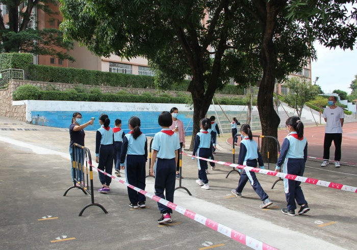 學生晨檢是在學校防疫工作中一個最常態(tài)的場景,學生在保安和值日教師的指揮引導下,按地面標識相互間隔一米,佩戴口罩,有序測溫,如遇可疑病例學生,值日教師引導該學生由學校保健老師進一步復測,然后向值日組長匯報情況以及通知班主任,班主任模擬聯(lián)系家長并到現(xiàn)場、模擬非可疑病例,家長帶學生到正規(guī)醫(yī)院就診,最后衛(wèi)生專干楊老師對臨時觀察點進行全面的消毒。在演練中,班主任一一跟進,熟悉應急流程,了解跟蹤處理工作。