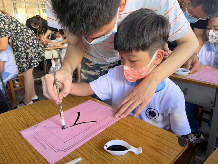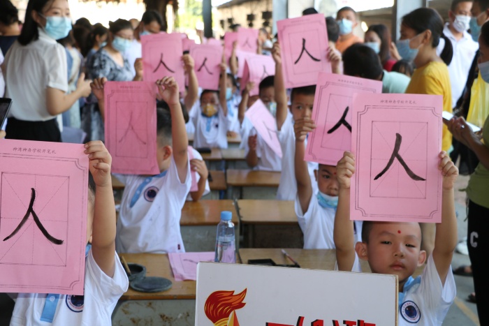 第五個(gè)環(huán)節(jié),到了描紅“人”字時(shí),學(xué)校常務(wù)奚水清校長(zhǎng)則上臺(tái)教同學(xué)們書寫“人”字,并大聲告訴同學(xué)們:“今天我們以一個(gè)‘人’字開筆,要把這個(gè)‘ 人’字也寫得堂堂正正、穩(wěn)穩(wěn)當(dāng)當(dāng)、神采飛揚(yáng)、氣勢(shì)非凡。這是因?yàn)槲覀冞M(jìn)學(xué)校學(xué)習(xí)首先要學(xué)會(huì)做人,做人首先就必須堂堂正正地立身”。