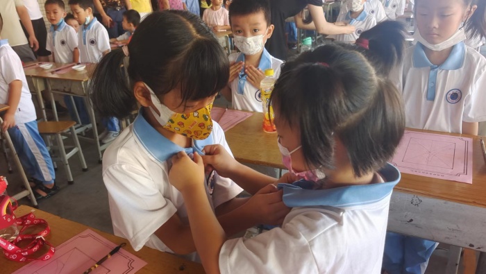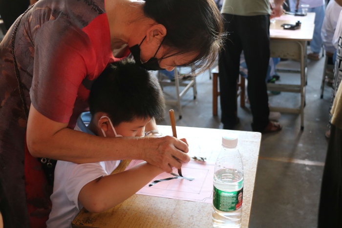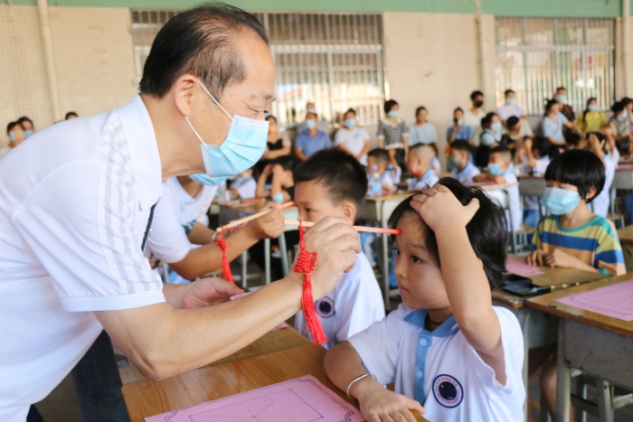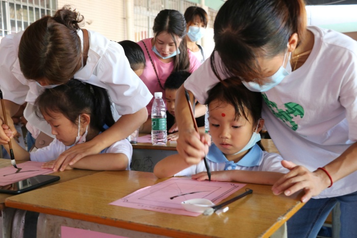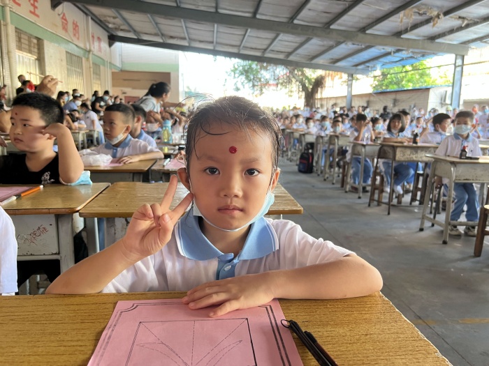 到了第三個(gè)環(huán)節(jié)則是“朱砂啟智”。在古代,學(xué)童入學(xué)讀書前,都會(huì)有啟蒙師長(zhǎng)用紅色的朱砂在學(xué)子們的額頭正中點(diǎn)上紅痣,稱為“開天眼”。當(dāng)中的“痣”通“智”,意為開啟智慧,以此寄托美好的愿望,從此眼明心亮,奮發(fā)學(xué)習(xí)。在這一活動(dòng)里,孩子們也紛紛亮出自己的天眼,感謝老師的啟蒙。