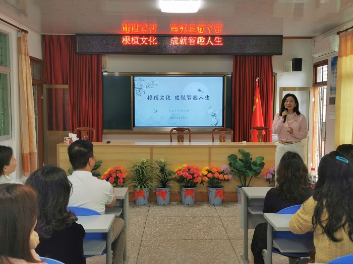中山市實驗小學鄭亞文主任作了主題為《根植文化 成就智趣人生》學校傳統(tǒng)文化教育工作分享。鄭主任分別從四個方面介紹了我校在中華優(yōu)秀傳統(tǒng)文化教育方面的工作經(jīng)驗。一是凸顯經(jīng)典,建設校園文化。我校文化環(huán)境建設體現(xiàn)了系統(tǒng)化、自然化、功能化的特點。二是科研引領,實現(xiàn)課程育人。主要介紹了學校語文學科4個傳統(tǒng)文化立項課題,這些課題研究方向明確,措施有力,研究成果豐厚。三是多元實踐,實現(xiàn)文化育人。我校堅持開展了傳統(tǒng)文化教育主題系列活動。如班會課、大課間、研學活動、學校的校園文化“四節(jié)”系列活動;學科教師將傳統(tǒng)文化教育與各自的教育教學相融合,還將優(yōu)秀的課例帶到了海外,收獲了好評。四是且行且思,拓新傳承視野。講座還提出了一系列值得探討的問題。與會的老師們受益良多,深切感受到:中華優(yōu)秀傳統(tǒng)文化是中華民族的精神命脈,是涵養(yǎng)社會主義核心價值觀的重要源泉。今后將繼續(xù)有效多樣地開展中華傳統(tǒng)文化教育,讓學生傳承和發(fā)揚中華優(yōu)秀傳統(tǒng)文化!