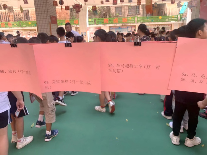 中秋節(jié)作為我國的傳統(tǒng)節(jié)日,它代表著團(tuán)圓,吉祥。為了讓學(xué)生了解中秋節(jié)的由來及風(fēng)俗習(xí)慣,感受中秋節(jié)的傳統(tǒng)文化,我們?yōu)閷W(xué)生準(zhǔn)備了一系列有關(guān)于中秋文化的燈謎。在燈謎區(qū),五顏六色的謎條在燈籠的映襯下,給中秋增添了濃濃的節(jié)日氣息。面對(duì)著生動(dòng)有趣的謎面,居民們爭相競猜,時(shí)而上手比劃、時(shí)而注目沉思,時(shí)而你一言我一語地互相討論著。