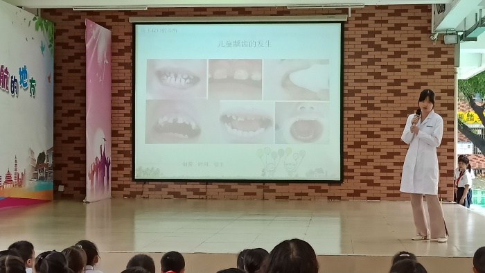 現(xiàn)場(chǎng)氣氛一度高漲,“同學(xué)們,大家知道我們一共有多少顆牙齒?”“你們知道正確的刷牙方法嗎?”在陳醫(yī)生通俗易懂的兒童牙齒保健知識(shí)的分享中,同學(xué)們聽(tīng)得認(rèn)真,答得踴躍,在愉悅的氛圍中清楚地了解到如何保護(hù)自己的口腔,預(yù)防口腔疾病。