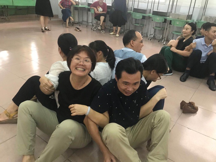 活動伊始,熱心活動“坐地而起”把教師們帶入狀態(tài),教師們分成三組,起始人數(shù)為3人,圍成一圈,背對背的坐在地上;3人雙臂相互交叉合力,一同站起來;隨后依次增加人數(shù),每次增加1個;最后選出人數(shù)最多且用時最少的一組為優(yōu)勝。該活動體現(xiàn)的是團(tuán)隊(duì)隊(duì)員之間的配合,明白合作的重要性。