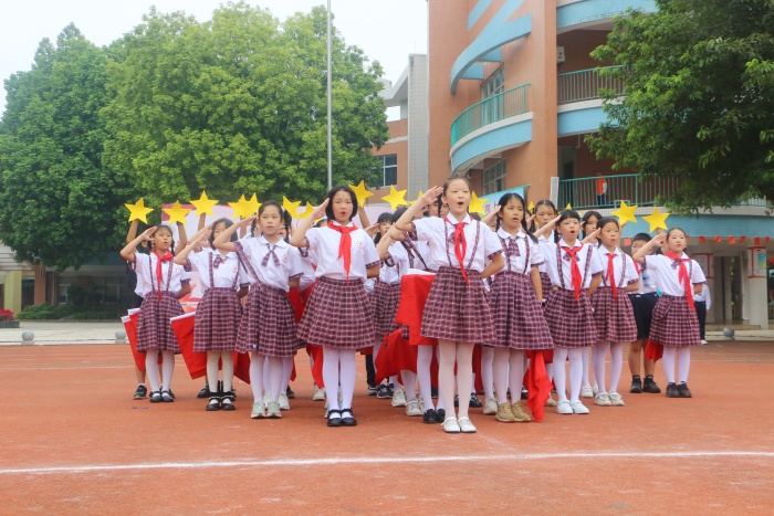 聽,二(4)班的小朋友們,以美妙的童心唱響《千字文》,“天地玄黃,宇宙洪荒……”,經(jīng)典的篇章跨越時(shí)光的長河,傳統(tǒng)文化在孩子們稚嫩的聲音中傳承;品,三(2)班的同學(xué)們,一個(gè)個(gè)化身為正在成長中的嫩竹,以班歌《向上吧》向大家訴說“青竹昂揚(yáng),節(jié)節(jié)向上”的班級(jí)精神;看,四(4)班的同學(xué)們踏著鏗鏘有力的鼓點(diǎn),武術(shù)動(dòng)作虎虎生風(fēng),扇子舞剛?cè)岵?jì),舉手投足之間皆是東方學(xué)子的蓬勃朝氣;賞,五(1)班的同學(xué)們揮舞鮮紅的旗幟,《閃閃的紅星》代表共產(chǎn)主義接班人的激昂斗志……